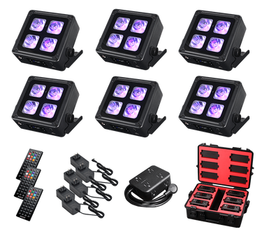 6 x fixtures, Injection Molded Case, 3 x Remotes, 6 Diffuser Filters, 6 x A/C Charger, 1 x 6 Way Charger, 2 x Manual